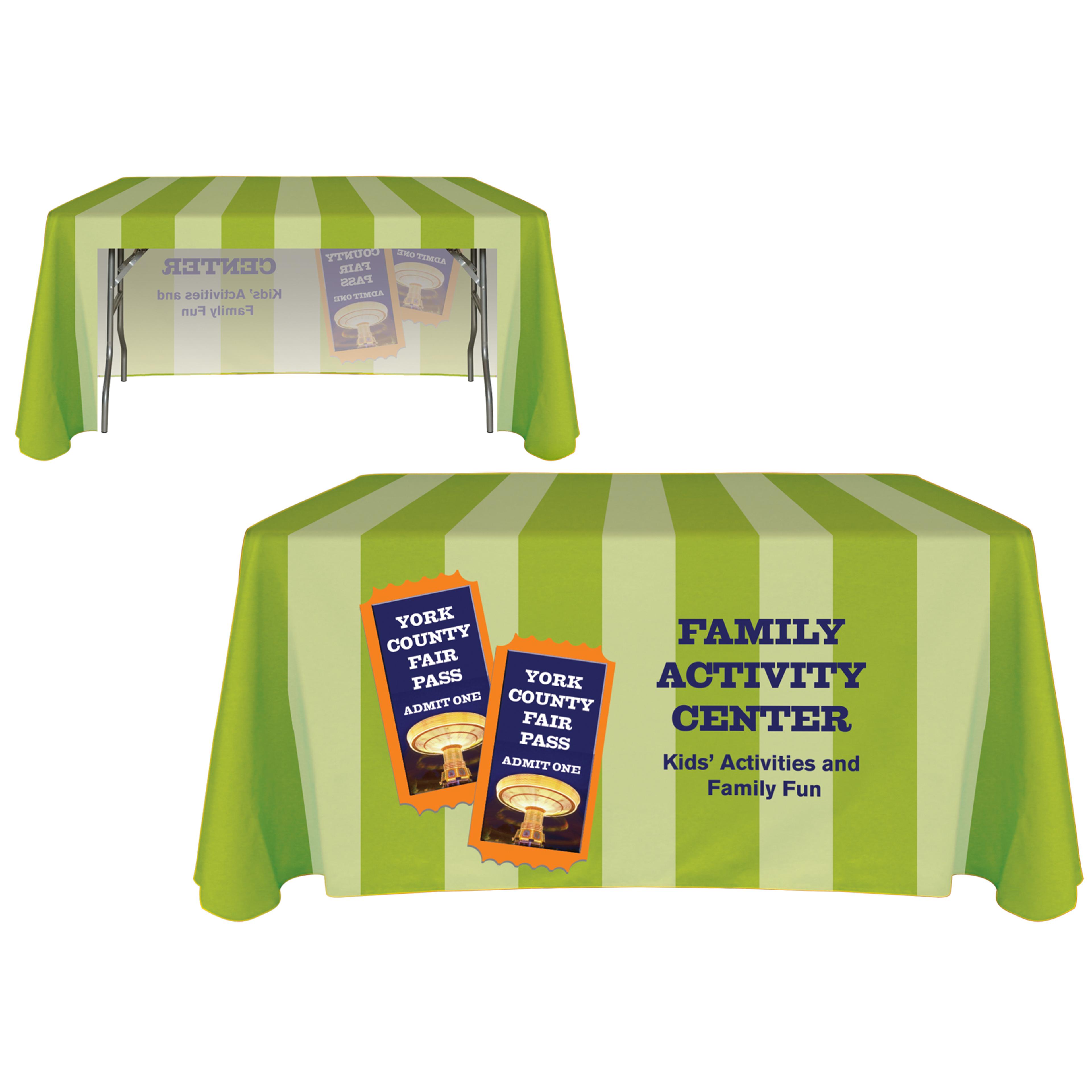 Give your booth an instant upgrade with the 4' Customized Open Back Throw Style Table Cover—a simple way to look polished, professional, and brand-forward at any event. Crafted from durable display polyester, it showcases your logo and graphics in vibrant full-color digital print with free PMS color matching for crisp, true-to-brand results. The open-back design keeps your setup sleek while giving you easy access to boxes, giveaways, and extra materials under the table. Ideal for trade shows, conferences, school events, and organizational displays, this USA-made table cover is a smart, high-impact branding essential that sets your table apart.
