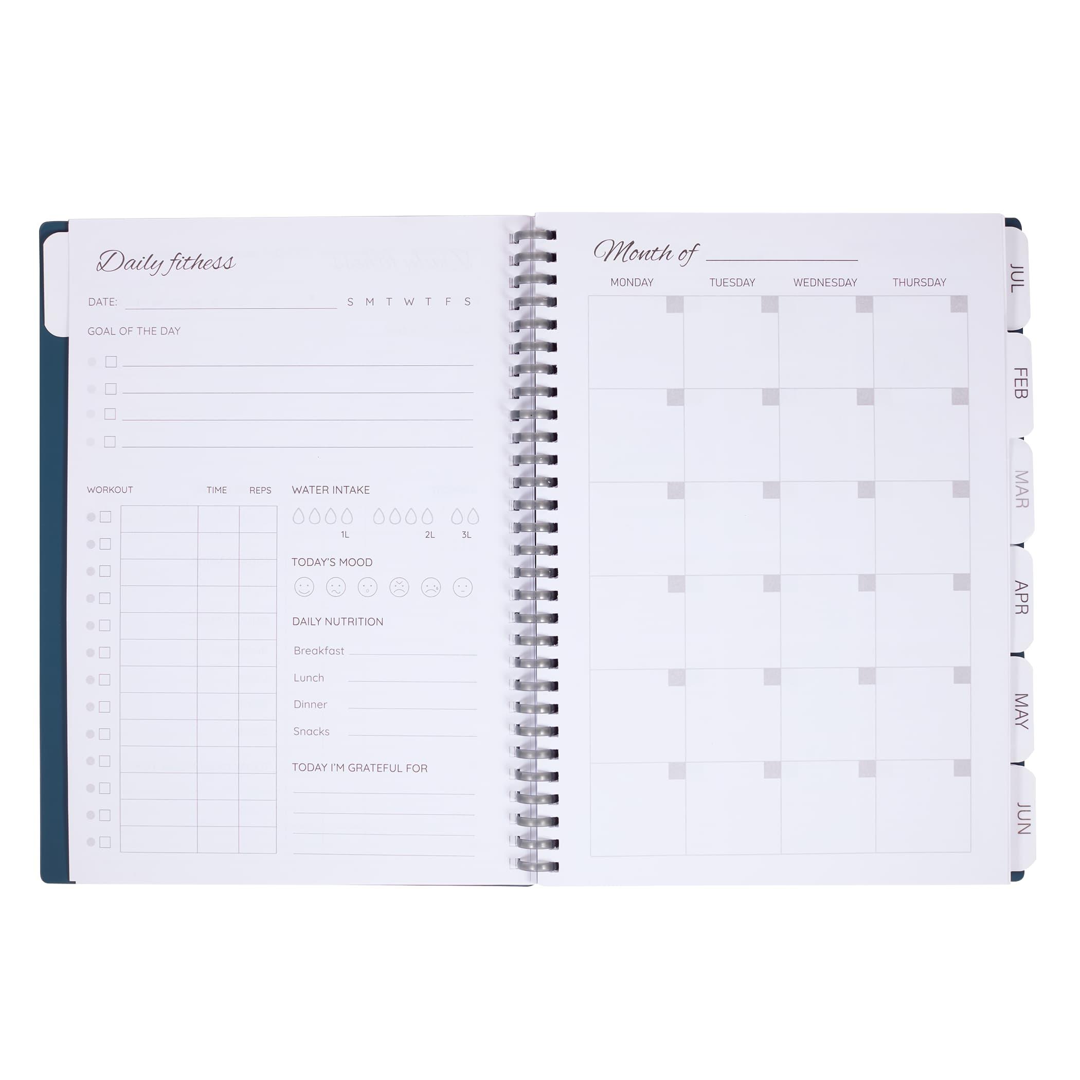 Stay organized your way with the Wellable™ Plan Well Undated Planner Journal, designed for flexibility and everyday productivity. The smooth recycled polyurethane cover and flexible binding make it easy to write, plan, and take notes on the go. Inside, undated calendar pages, task lists, and tracker sheets let you customize your schedule without restrictions, while a sticker flag page helps highlight key goals and priorities. Packaged with a branded FSC® Mix bellyband, it’s a smart, sustainable tool for focused daily planning.